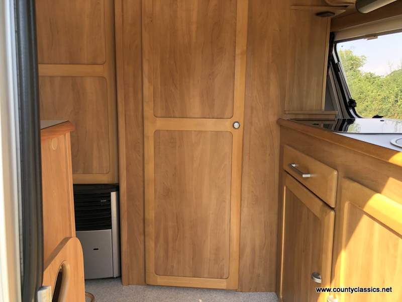 Accommodation: light beechwood effect satin finish cabinets throughout, spacious 4 seater dining table and sofa area which all folds to a large double bed . The table top is removable and can be also attached to the exterior of the van for outdoor dining, dinette seating is upholstered in ‘as new’ saddle coloured leather, useful storage area under seats.
