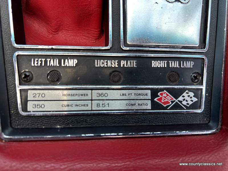 Vin 1943715107826 the VIN number indicates the car to be built in St Louis, supplied in Mille Miglia red with 350 Ci engine and 4 speed manual gearbox. Coupe body style (January 1971 F26) red vinyl trim 407, 350 Ci V8 engine 5.7 litre., 360lbs dt torque, 8.5:1 compression ratio. 270 BHP. Engine number 13B559470 T0329CKJ.