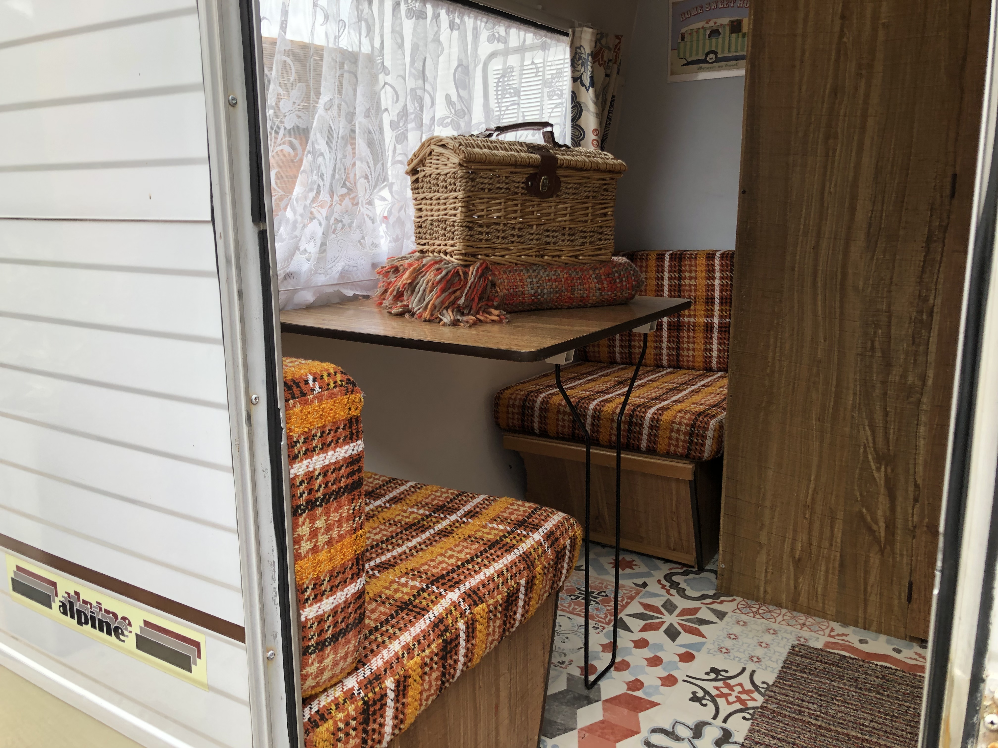 Sprite Alpine (vintage retro) caravan. 12 Ft long + 3ft 6” draw bar. 1983 3 berth 735 KG – lightweight - Tow behind most cars. This is a beautiful period English caravan, which has been fully restored by spray Tech Autopaint, classic car restorers. It has had a full strip down inside and out and was treated to a complete respray including the roof. All the original decals have been correctly preproduced and reapplied to the van. All the internal wallboards were removed and replaced, and any rotten timbers / boards removed and replaced with new. A new floor was fitted before the van was then refitted back into as close to original condition as possible, with a few tasteful period touches added. All the windows and window seals are in very good condition. As it is the totally solid chassis. The draw bar has been rubbed down, treated, and repainted. All works can be seen on numerous photographs. It comes with the following: Hob and cover Kitchen sink and cover Fridge 12 v leisure battery and charger 12 v LED lighting. Double bed / 4-seater dinette. Single bed / 2-seater dinette. Bathroom sink. Numerous cupboards. Cutlery drawer. Outdoor table. Side awning. Original / retro / seat coverings, flooring, curtains, and cabinets etc. Opening skylight hatch. Propane bottle and regulator. Upgraded insulation throughout (fitted when restored). Miscellaneous small accessories. Although this van is early 1980’s it oozes 1970’s styling and in our opinion is super cool yet very functional being both short and lightweight. Superb for a couple or Mum, Dad and child. In typical period style it is plain and simple so would lend itself to further personal tasteful cosmetic enhancements which could easily be carried out by any new owner, as all the hard work has been done for you. These small retro caravans are increasing rapidly in price and popularity, so please don’t hesitate to call Andy on 07595 218406 and arrange to view it (just outside Gloucester). We love it!