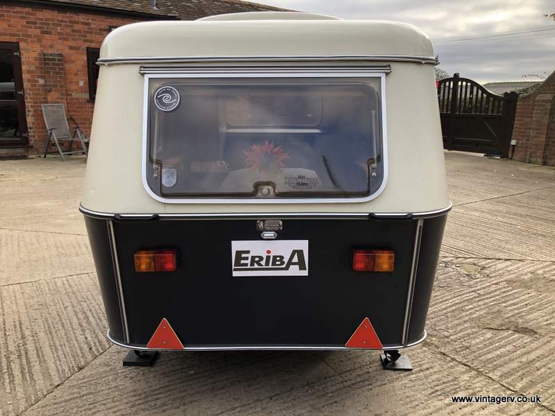 Eriba Puck Classic Pop Top Mini Caravan. 1980. 2 berth. A beautiful original example of one of these iconic little caravans. A very well cared for example/ Only 500kg – most small cars can tow it. 2 tone ivory over royal blue exterior. Period alloy slot mag wheels. Excellent tyres. 240 v hook up facility with long lead. Electrolux fridge. Two burner gas hob. Kitchen sink with pumped water. Water bottle. 240 & 12 v lights. 12 v leisure battery. Plastic double-glazed windows with rear opening window. Twin bench seating with storage under. Seating cushions fold down to as decent sized double bed, 5 ft wide x 6’ 3” long. Removable dining table - can also be used outside. Roller style window blinds. Small wardrobe and mirror. A few small cupboards. Excellent pop top side canvass with additional covers and removable net curtain for canvas vent holes. Bottles and jar storage inside entry door. Butane gas bottle. Hitch lock. Fabulous original, orange brown and cream upholstery in great condition (very cool!). Light oak coloured flooring and cupboards. Original internal wall covering in excellent condition. Tows very well (easy, one man can handle it). No corrosion, no damp, dry fresh and clean. These very cute Eriba Pucks are now considered a full on classic mini caravan, with lovely retro styling. Great for weekends away, festivals, stay-cations etc. looks fantastic behind a classic car or VW bus etc. There is an enthusiasts owners group for Pucks with lots of useful tips and guidance and with a fun social scene around it too! Happiness is a great puck! Invest and enjoy www.countyclassics.net for more pictures, information, and video.
